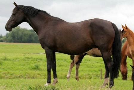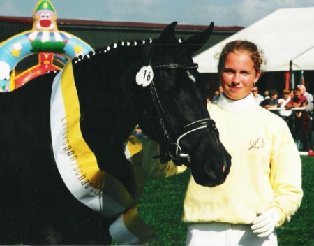 Vater Donauwind wurde 1983 als Reservesieger in Schleswig- Holstein gekört. 1985 legte er seine HLP in Münster- Handorf als drittbester Hengst ab. Für seine Umgänglichkeit erhielt er dir 9,0, für sein Springen die 8,0, genauso wie für seine Leistungsbereitschaft. Donauwind lieferte neun gekörte Söhne, darunter den bis St. Georges platzierte Dexter/ Kathrin Stolz bzw. Kathinka Knebusch, der zudem in L-Springen erfolgreich war und 1990 am Bundeschampionat in Verden teilnahm (3j.). Mutter Elitestute Flicka ist die Stammstute unserer Ponyzucht, sie brachte neben dem gekörten und bis M-Springen erfolgreichen Hengst New Star, fünf weitere Staats- und zwei Verbandsprämienstuten. Alle Nachkommen dieser Stute zeichnen sich durch eine überragende Rittigkeit aus. Sie alle legten super Stutenleistungsprüfungen ab und waren unter jungen Reitern im Basissport erfolgreich. First Girl legte ihre Leistungsprüfung mit einem Gesamtergebnis von 7,75 ab, sie erhielt unter anderem für den Trab eine 9,0. Aufgrund ihrer Nachkommenleistung wurde First Girl als Elitestute ausgezeichnet. Sie brachte in sieben Zuchtjahren drei Staatsprämienstute, die allesamt eine gute Pürfung ablegen konnten und zwei Hengstanwärter. First Girl war im Jahr 2000 Siegerin der Landesponyschau und auch 2009 in Verden wurde sie Ia-prämiert und war Mitglied der Siegerfamilie. Ihr Sohn Nicht Schlecht P von Nancho Novo erhielt in Verden das begehrte positive Körurteil. Ihr Special Dream - Sohn Sarasani P ist mittlerweile im bayrischen Juniorensport hocherfolgreich. Er gewann in 2014 u.a. die goldene Schärpe. Auch die Anpaarung an den weltweit erfolgreichen Beschäler Golden Highlight war ein voller Erfolg. Giorgio Armani zeigt bereits dreijährig unter dem Reiter großes eins von nur zwei Fohlen, die die bewährte Rappfarbe tragen. Er wurde als Hengstanwärter verkauft. | |