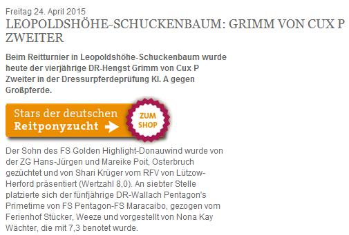 Grimm von Cux P erfolgreich in die Saison gestartet! Grimm von Cux P konnte anlässlich des Reitturniers in Leopoldshöhe-Schuckenbaum eine Schleife erringen. Unter seiner Besitzer- und Reiterin Shari Krüger erreichte er in einer Dressurpferdeprüfung der Klasse A gegen Großpferde Rang 2. Seine Vorstellung wurde mit der Wertnote 8,0 bewertet. Wir freuen uns mit der Besitzerin über diesen Einstieg in die Saison 2015 und sind gespannt auf den weiteren Saisonverlauf. |